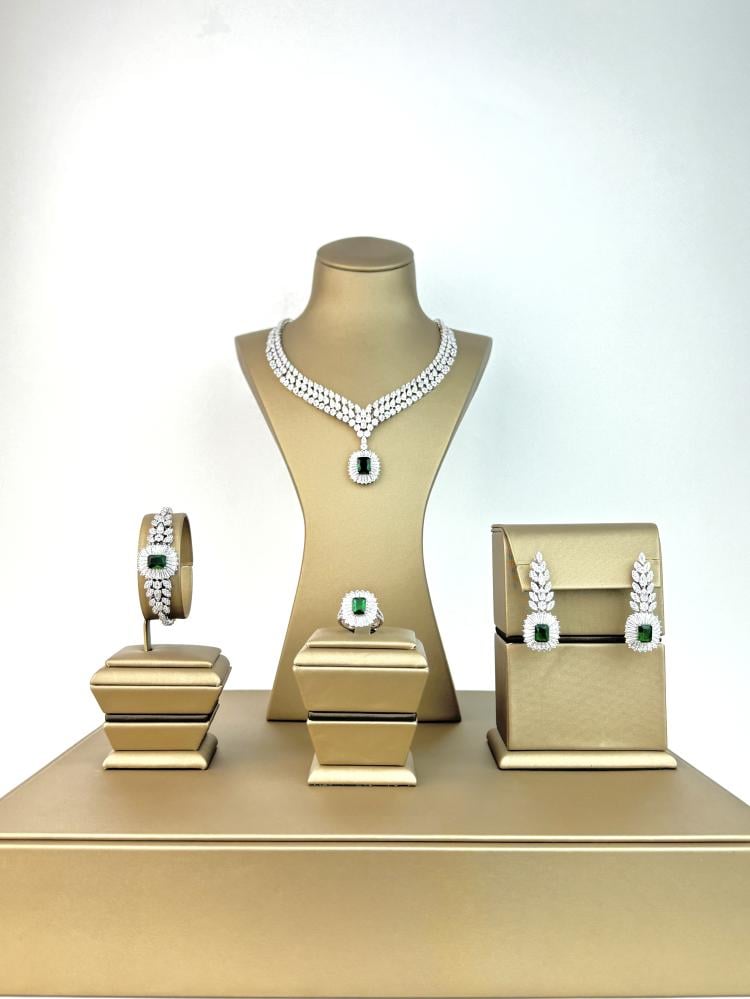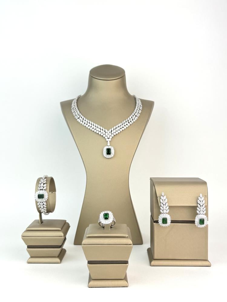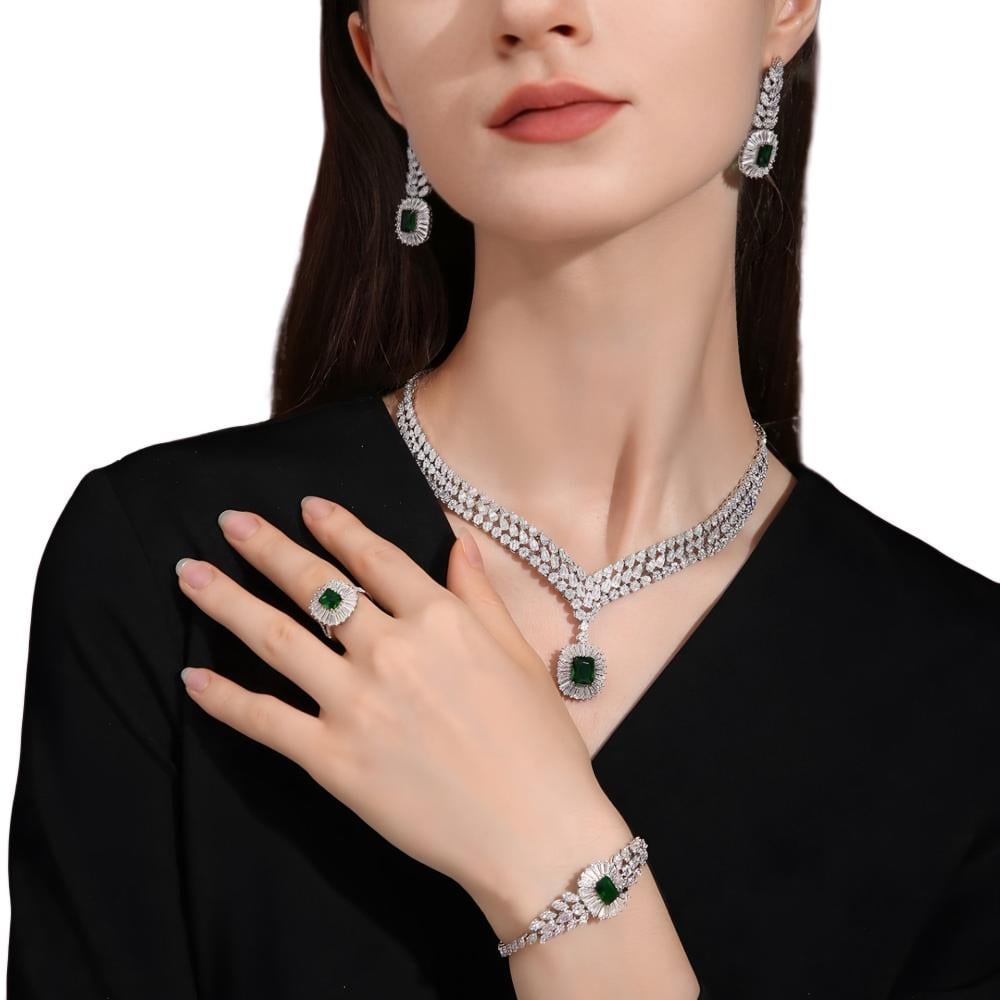 صُنع هذا الطقم بعناية فائقة باستخدام أجود أنواع الزريكون للحصول على بريق يشبه الألماس، بينما يضفي الفص الأخضر لمسة من السحر والفخامة. سواء كنتِ تبحثين عن قطعة استثنائية لحفلة خاصة أو هدية فاخرة لشخص عزيز، فإن هذا الطقم هو الخيار الأمثل.