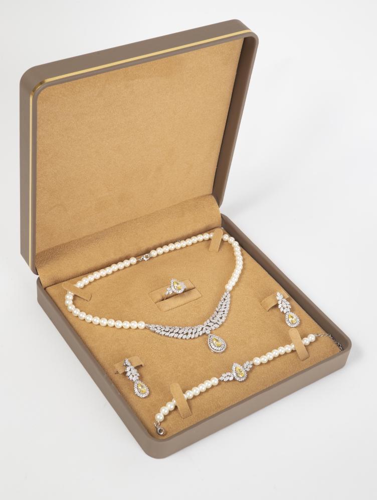 يأتي الطقم داخل علبة فاخرة تعكس قيمة القطع وأناقتها، مما يجعله الخيار المثالي للإهداء أو لمناسباتك الخاصة. مصنّع من أجود الخامات مثل الزركون المصقول الذي يحاكي بريق الألماس، واللؤلؤ الفاخر الذي يعكس لمسة طبيعية جذابة.