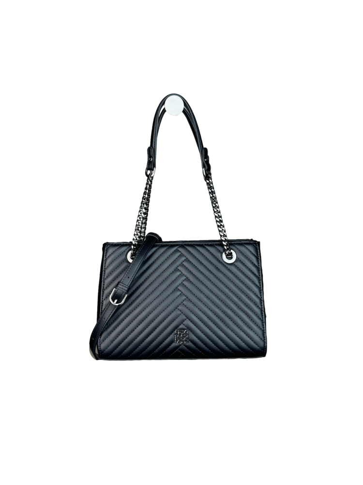 حقيبة الجلد الأسود هذه هي الاختيار الأمثل للمناسبات الرسمية، كما أنها تعد إضافة أساسية إلى خزانة ملابسك اليومية. تصميمها الفاخر يتيح لكِ الجمع بين الأناقة والعملية.