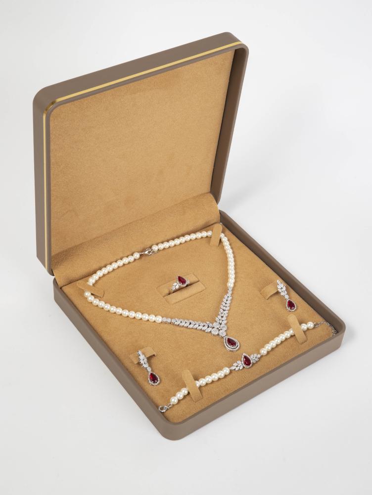 يحتوي الطقم على إسورة فاخرة مصممة بدقة، حلق مستوحى من الطبيعة يعكس بريق الزركون ولمعان اللؤلؤ، خاتم مميز يناسب جميع الأحجام، وسلسال طويل يزينه فص أحمر فاخر محاط بوهج الزركون المتألق. يأتي الطقم داخل علبة فخمة تضيف لمسة من الفخامة وتجعله هدية مثالية.